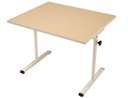 A worktable that offers cost-effective height adjustment and ample knee space to accommodate children and adults who use wheelchairs. The table can be tilted to adjust from 0° to 50 °, offering various positions for accessibility or rehab activities that require a tilted surface. The front edge features a 1/2″ lip that adjusts to be either flush or raised to the work surface, keeping books or work materials positioned when the surface is tilted.